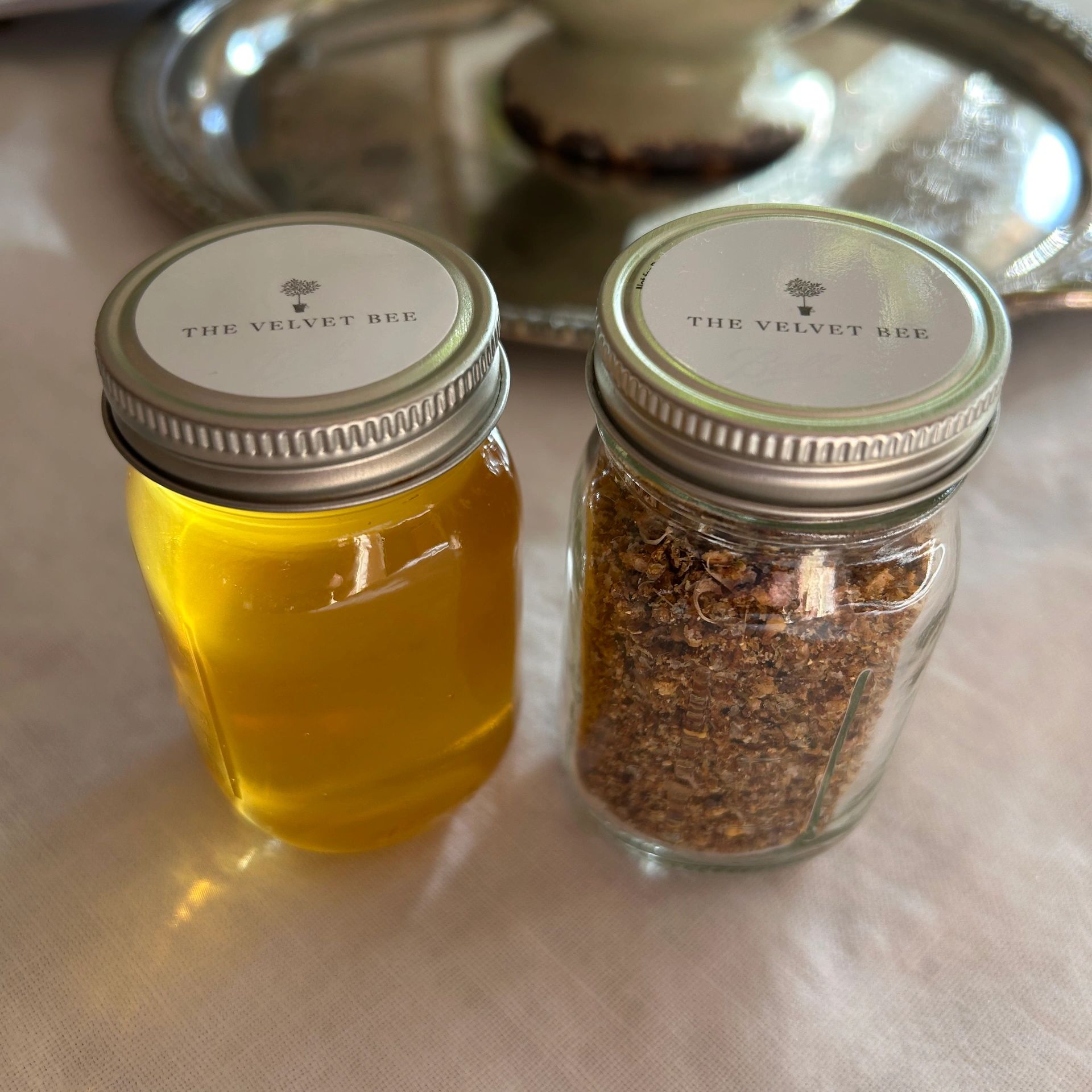 Fresh honey and pollen from our treatment free hives. $10. per 4oz jar.